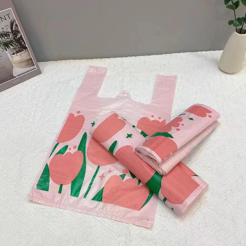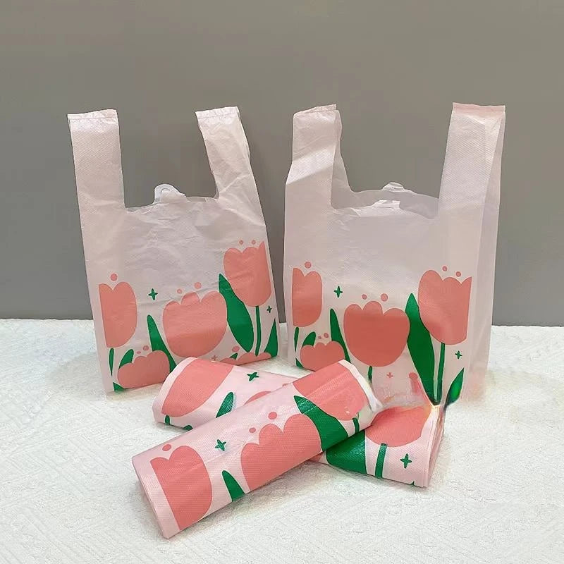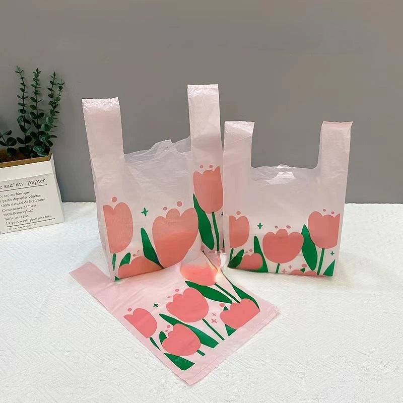 50Pcs Pink Tulip Clear Shopping Packaging Bag Plastic Cute Flower Gift Bags For Jewelry Candy Store Small Business Supermarket